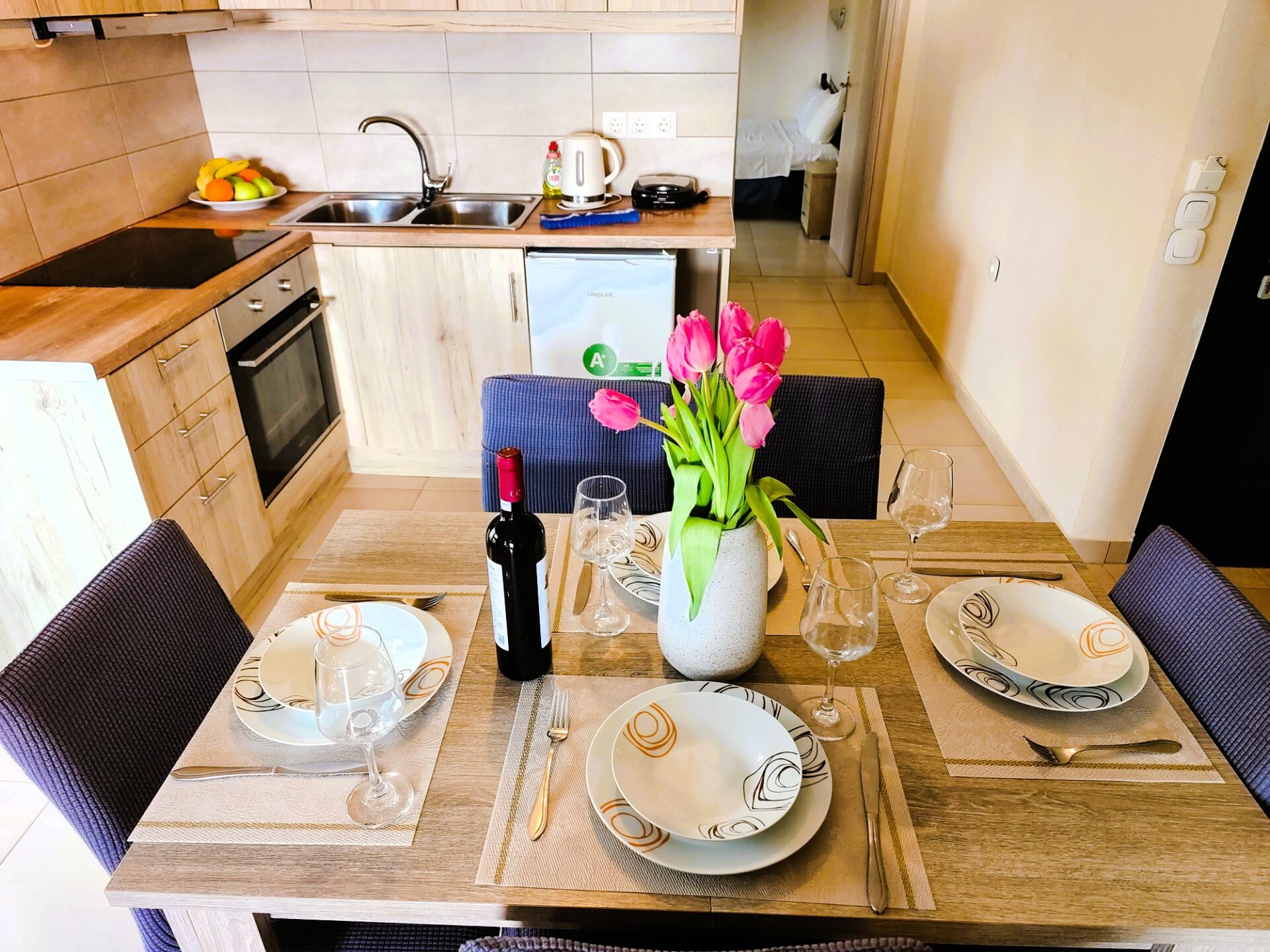 Inside, you will find a cosy living area with a Smart TV, fast internet access, and a dining table comfortably seating up to four guests. The well‑equipped kitchen provides everything you need to prepare meals with ease. The apartment is fully air‑conditioned throughout to ensure your comfort during warmer days.